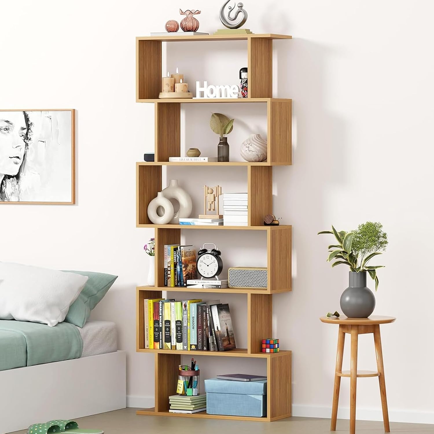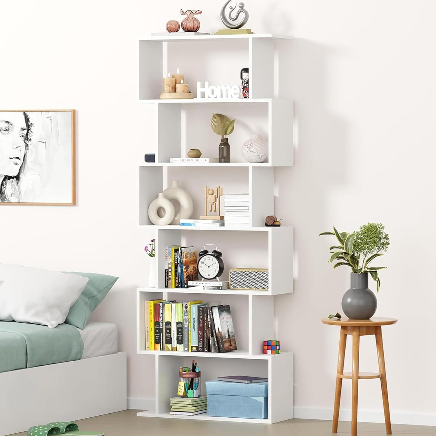 Product Features = 6 Spacious Layers – Offers ample storage for books, décor items, collectibles, and essentials while keeping everything organized., Compact & Space-Saving – Maximizes vertical storage, making it ideal for small apartments, offices, and tight spaces., High-Quality Engineered Wood – Durable, sturdy, and resistant to everyday wear and tear for long-lasting use., Multipurpose Usage – Functions as a bookshelf, display rack, storage organizer, or room divider, suitable for homes and offices., Unique S-Shaped Design – A modern, geometric structure that enhances any space with a stylish and contemporary look.
