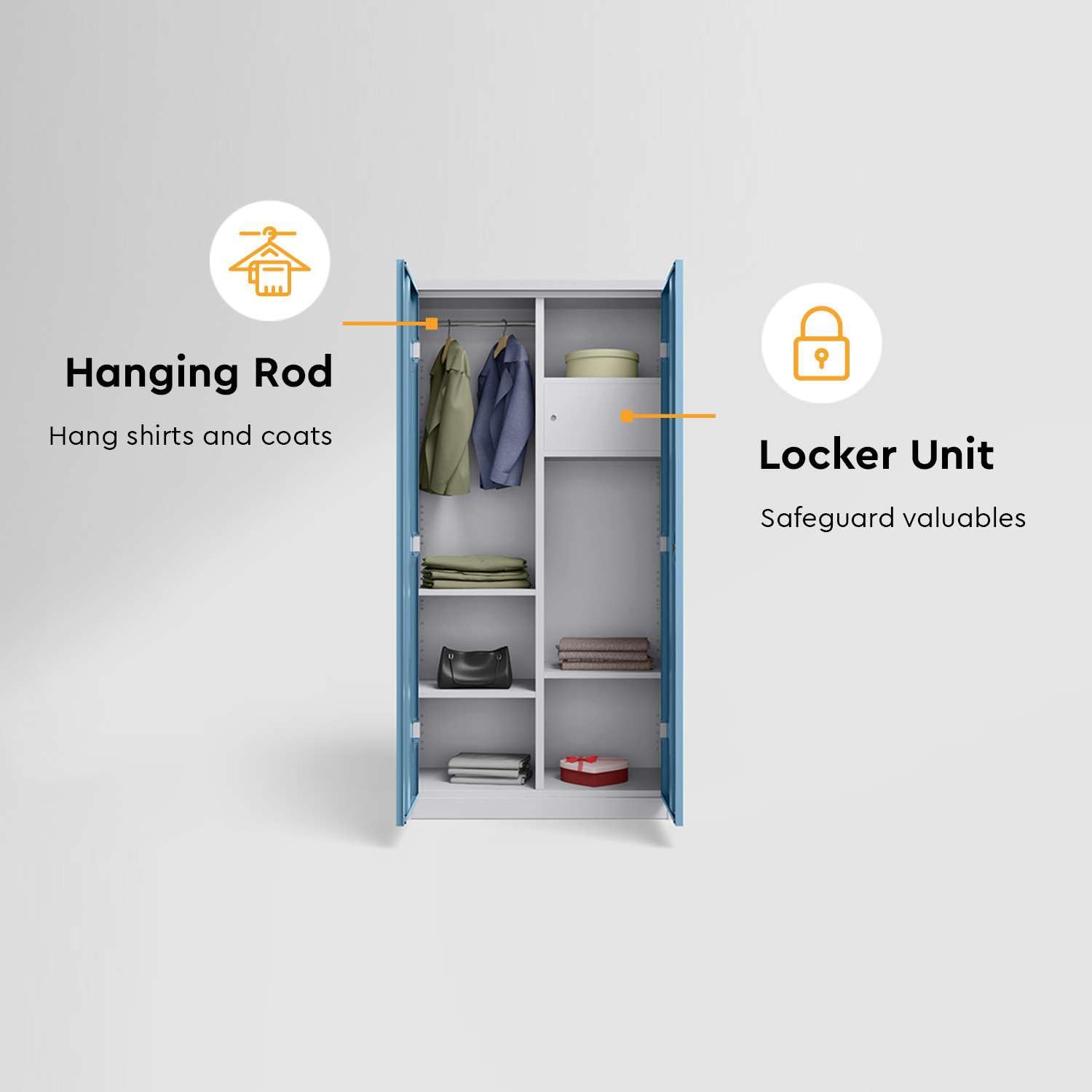 .Smart Internal Layout - Includes multiple shelves and a dedicated hanging rod for organized storage of clothes and wrinkle-free garments.